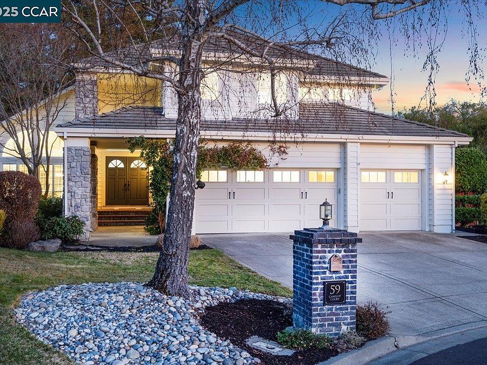Welcome to this inviting home at the sunny end of Camelot Court! This beautifully updated residence offers 3,052 square feet of thoughtfully designed living space, perfect for both everyday living and entertaining. Foyer with sweeping staircase, thoughtfully remodeled kitchen and all 3 bathrooms! Freshly painted & new carpet throughout, creating a bright atmosphere. With 5 spacious bedrooms and 3 full bathrooms, this home provides ample space for all your needs.The main-level bedroom and full bath offer convenience and flexibility, ideal for guests or a private office. Gourmet kitchen offers stainless steel appliances, slab granite counters, island and plenty of counter space for culinary creations & tons of storage with under and over cabinet lighting. Sunny eat-in breakfast area with windows showcasing the peaceful rear yard and patio. The adjacent living area seamlessly connects to the outdoor space, making it perfect for gatherings or enjoying peaceful moments. The primary suite is a true retreat with a luxurious en-suite bathroom, fireplace & two generous walk-in closets w/custom built-ins. Three additional generous-sized bedrooms and beautifully remodeled full bathroom upstairs. Mature landscaping enhances the serene setting at the end of the court! Security gate & tennis!