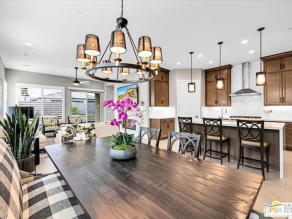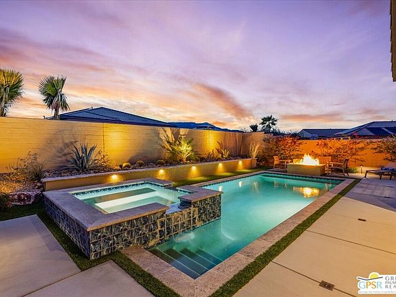 Immaculate Tuscan-Inspired Retreat with Private Pool & Spa in Del Webb Rancho Mirage - Step into luxury with this stunning Tuscan Expedition Plan 3 home, nestled in the prestigious 55+ community of Del Webb Rancho Mirage with Owned Solar. Offering a seamless blend of elegance and modern comfort, this meticulously designed residence features two bedrooms, a versatile den/office, and two bathrooms, all within a thoughtfully designed open-concept layout. From the moment you enter, you'll be captivated by high-end upgrades throughout, including 12x24-inch porcelain tile flooring, built-in CAT-6 wiring, whole-home audio, a water softening system, and a 240-volt pre-wire - perfect for EV charging. The chef's kitchen is an entertainer's dream, boasting floor-to-ceiling upgraded cabinetry, quartz countertops, premium KitchenAid Pro appliances, and an expansive island with a waterfall edge and seating ideal for gatherings. The great room is equally impressive, featuring a gas fireplace, built-in audio system, and expansive views of the resort-style backyard. The primary suite is a serene retreat, offering picturesque views of the private pebble-tech saltwater pool and spa, a spa-inspired ensuite bath with dual vanities, an oversized walk-in shower with a bench, and a spacious walk-in closet. The guest suite is thoughtfully positioned on the opposite wing, providing privacy, a walk-in closet, and easy access to the secondary bathroom. Designed for indoor-outdoor living, this home features an extended covered patio with built-in bbq, zipper shades, custom landscaping, and breathtaking mountain views - your private desert oasis. Beyond your personal retreat, Del Webb Rancho Mirage offers resort-style amenities, including a state-of-the-art fitness center, tennis courts, pickleball, a stylish bar & lounge, and more. Experience the ultimate in luxury and relaxation - this home is a must-see!
