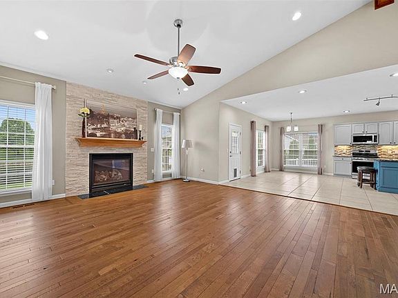 Impressive ranch on a spectacular lot! This 4 BD, 3.5 BA home has 2,199 s/f on the main plus 1,387 s/f in the finished LL for approx 3,586 s/f of living space. The ext has brick, low maintenance vinyl, 18 ft W gar door, arch shingles, lush landscape, wifi controlled irrigation, exp aggregate drive/walkway, fencing and an 18x16 patio w/pergola overlooking a neighborhood lake. Features include 9 ft ceilings, vaults, island, granite c-tops, SS appl, gas range(2025), D/W (2025), tile b-splash, beverage station w/fridge, wood flrs, elec FP(2025) w/stacked stone, W/I closet w/cust org in the Primary, Updated Primary Bath (2023), raised height double bowl vanity, ceramic tile flrs, marble shower, attic fan, M/F laundry, oversized garage w/full drywall & 50 gal W/H. The finished LL has a Fam Rm, Rec Rm, Office/Craft Rm, wet bar, full bath, Workout Rm & Flex Rm. See the list in Maris of included items. Francis Howell schools, Warren Elementary. Beautiful home, stunning lot, SO MUCH TO LOVE!