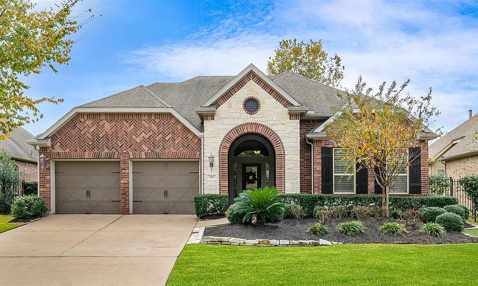 Absolutely stunning 1.5 story David Weekley brick and stone home in Creekside Park. Walking distance to Rob Fleming Park and highly rated Creekside Forest Elementary. Perfect for entertaining, this open flowing floorplan features gorgeous wood flooring throughout. Stunning kitchen with granite counters, undermount sink, upgraded cabinets, island with breakfast bar, and stainless steel appliances including double oven and gas cooktop. Spacious family room with gas log fireplace. Formal dining & study with closet could be 4th bedroom. Private master suite with tray ceiling, separate his & hers vanities with granite counters, soaking tub, and oversized shower. Door in master closet conveniently leads to utility room. Secondary bedroom with full bath also downstairs. Game room and large bedroom with full bath upstairs. Two covered patios for entertaining or relaxing. Beautiful landscaping with full sprinkler system. Great location with easy access to shopping and dining. Never flooded!