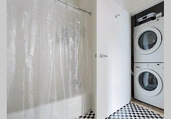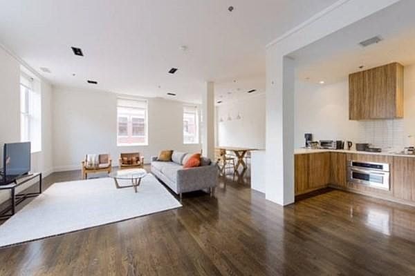 Lightly furnished, with enough to live comfortably or bring your own belongings in addition. Wonderful, spacious, South End loft with garage parking! Corner unit with very high ceilings, rich dark wood floors, custom lighting (ideal for your art collection), and oversized windows. The main living area is wide open, with ample room for dining, living, and working from home. Compact, efficient kitchen with attractive cabinetry and breakfast bar. Serene master bedroom with huge walk-in closet, second bedroom or study with stylish sliding barn door. Full bathroom with stackable washer/dryer. Central air.