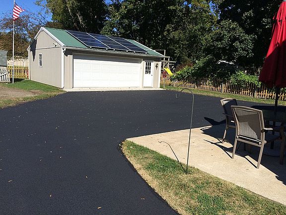 Hardwood floors, newer bathroom, partially finished basement, central air, solar panels, gas heat in house and garage.