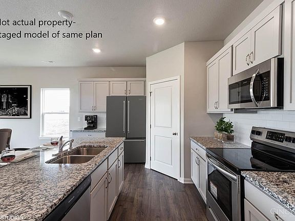 - Features: Kitchen Island, Laminate Floor, Marble/Granite/Slate, Pantry, Wood Cabinets