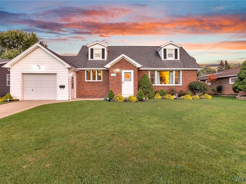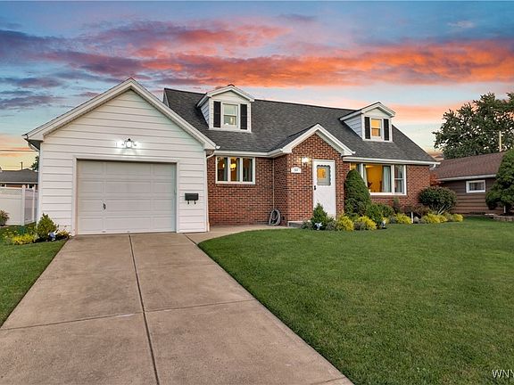 Welcome to 59 Greenbranch Road. This expansive 4 Bedroom Cape in West Seneca has been meticulously maintained. Curb appeal abounds as you enter this special property with a maintenance free brick and vinyl exterior and concrete driveway. Gleaming hardwood flows through the main level as you transition from room to room. The walls and ceiling throughout this home have been beautifully refinished and tastefully painted with neutral, inviting colors. Live and entertain with ease in the large living room, formal dining room and pristine fully, applianced eat-in kitchen. The spacious first floor bedroom could easily function as a family room, den or home office. A convenient half bath completes the first floor. The second level boasts three additional generous bedrooms with great storage options and a timeless full bath with modern updates. The full, dry basement provides both storage and function with a partially finished area perfect for entertaining and everyday living. Enjoy the outdoors on the patio overlooking the partially fenced backyard. Beautiful, mature landscaping surrounds the exterior. Experience peace of mind with an abundance of capital improvements including updated vinyl (2010) and Anderson (2013) windows, new electrical service (2017), hot water tank (2020), Lennox Furnace (2011) and Central Air, Garage Door (2014) and Drainage System by Frank’s Basement Systems. Located in fantastic, walkable neighborhood close to parks, shopping, restaurants and more! West Seneca West Schools. Offers will be entertained starting on Friday, October 10th at 12pm.