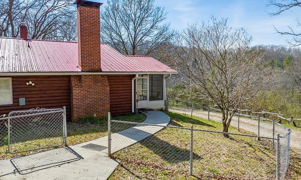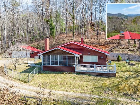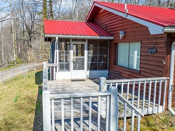This rustic log-sided cabin would make a great vacation home, Airbnb, seasonal rental, or year-round living- it's up to you! All main-level living with a fenced-in portion of the yard, a 20 x 10' +/- screened porch with tile flooring, vinyl windows, and a peaceful mountain view. Inside is floating flooring throughout and a large open living/ dining/ kitchen with a focal brick wood-burning fireplace for those cool evenings. Knotty pine walls throughout add to the rustic feel. A detached 22 x 22' +/- garage has a 14 x 11' +/- attached workshop area. Updates include PEX pipes, whole house filter, electrical, water heater, and electric oven/range. The home is located only a short distance off a state-maintained paved road less than 10 minutes from town! Home being sold As-Is.