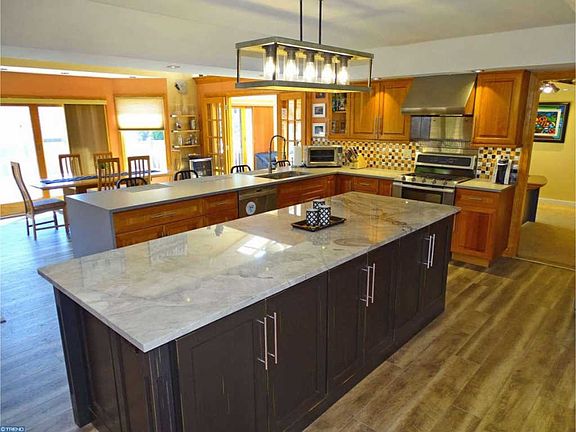 Live the Dream!! Incredible Custom built 4 Bedroom, 2.1 bath home with an expanded kitchen that will exceed the dream of even the most discerning buyer! Not to mention a sun room with 6 skylights, a huge finished basement with a custom bar AND a Carlton Free Form Salt Water Heated Pool. The tour begins in the Foyer with the newly installed Grey Wood-like textured flooring which leads you through to the kitchen. All the rooms are over-sized beginning with the living room bright from the triple windows. Currently used as an office, there is a formal dining room outside of the kitchen with a tray ceiling. Now for the Kitchen. A huge center Island greets you with a beautiful granite counter top on Espresso colored Cabinets. The microwave built in the Island makes life so easy for entertaining. Maple Cabinets are adorned with Quartz countertops , stainless steel appliances and a Hood with heating lamps which vents to the outside. The coordinating backspace ties it all together. Enjoy your meals at the 4 seating breakfast bar or sit in the breakfast area with its vaulted celling, basking in the light from the many windows and sliders surrounding you. The adjoining Sun Room is entered through the glass French Doors and is also adorned with many Andersen Roll Out Windows. Note the stunning custom blinds throughout this home, the Kitchen ones are motorized for your convenience. There is a large Deck and dog walk surrounding the back of the house with many entrances to it. The family room, which also opens to the Kitchen has a floor to ceiling stone wood burning fireplace surrounded by newly installed Hardwood hand scraped flooring. There are no disappointments in this house. The Master bedroom suite has its own sitting room with plantation shutters and a just finished renovated full bathroom with a stall shower and a furniture style vanity. The other 3 bedrooms are also well sized, 2 with plantation shutters. The shared hall bathroom has also been upgraded with a double sink vanity with a granite counter top. The very large basement has a bar area with a custom bar with seating for 5, another recreation/media room and a huge storage closet. Now to venture out back. Vacation at home with your in-ground pool over looked by a deck, a bridge connecting them, and a decorative pond with a waterfall. Even your dog will be ecstatic walking on his very own dog run. Most doors and windows have been replaced. Upgraded to Propane, enjoy gas heat and cooking. A fabulous house