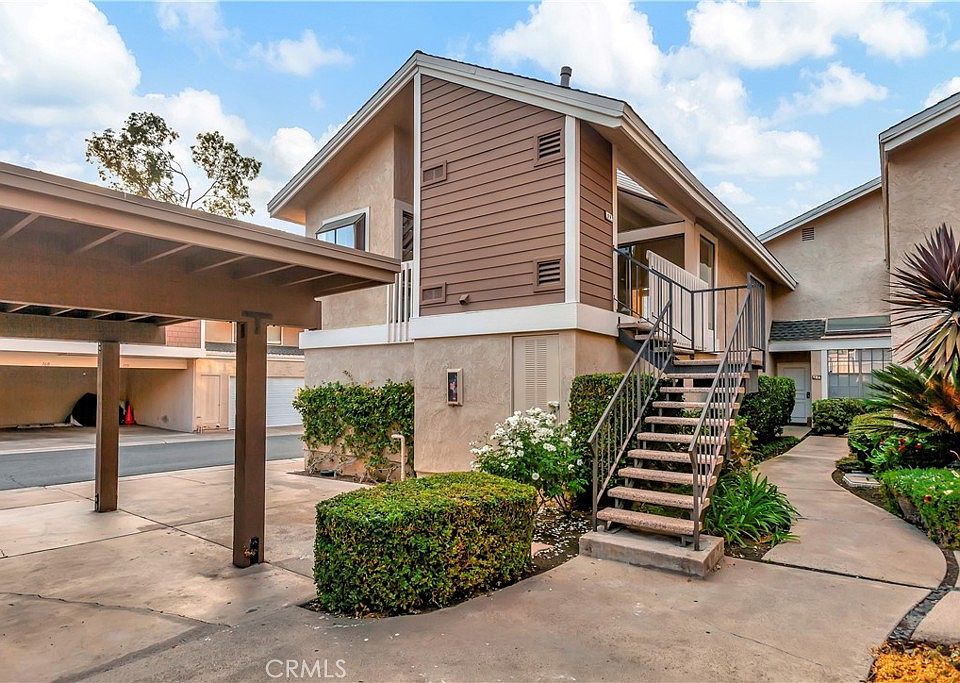 Freshly refurbished home! Tens of thousands of dollars just spent updating this home - $3200 in beautiful new appliances - Upper unit, no one lives below -****LARGE 850 sq ft **** 1 bd, 1 bath condo - it's HUGE - there is a large living room, separate dining room, large kitchen WITH OFFICE area at the end! Large bedroom, dressing area, separate private toilet and tub area with Blue Tooth exhaust fan to play your favorite music - large walk-in closet - lots of cabinet storage! ALL CATHEDRAL CEILINGS! Light, bright, open, airy - there is a skylight in bedroom - lots of windows - ALL NEW RECESSED LED Lighting - freshly painted, scraped ceilings, new beautiful carpet and luxury vinyl plank flooring in kitchen and bathroom, upgraded baseboards throughout, new faucets and fixtures, great new showerhead with separate wand, new Blue Tooth exhaust fan in bathroom - freshly coated countertops bathroom and kitchen, freshly coated tub and surround - it's just GORGEOUS! There is a lovely large deck out front, your own private laundry is right there for your washer and dryer; (the other 1 bedrooms on the market in the area are smaller by about 200 sq ft and do not have private laundry) - this one is 850 sq ft per the builder! IRVINE SCHOOLS, shopping walking distance - beautifully maintained complex with streams - assigned private carport parking steps close. Eat-in kitchen area is large enough to make it your own office or use DR as office and still have eating area for table and chairs - lots of choices with this condo! NO MELLO ROOS! Assigned carport is steps away.