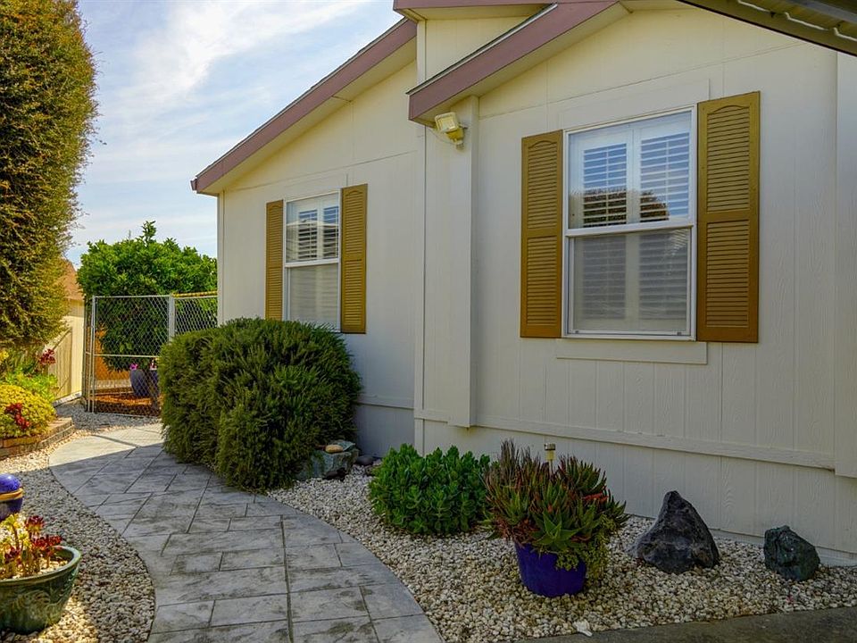 This manufactured home is situated in a corner lot with no rear neighbors in the sought-after Lemon Tree Park community, known for its desirable location and exclusive amenities for residents aged 55 and older. The cul-de-sac is private with not a lot of car traffic. This home that has a large deck for morning coffee and a large yard with low maintenance. Inside, the home is spacious with many special features. The open concept kitchen has been updated with newer white soft close cabinets, custom spice cabinets, extra deep drawers, backsplash, natural light with two solar tubes and plenty of room for cooking and dining. A gas range stove, custom lighting, and granite counter tops. The primary bedroom is a retreat with an extra large bedroom with a ceiling fan. The custom primary bathroom has tile flooring with a walk-in tile surround shower with custom shower heads and a double sink vanity. A guest bedroom, off the living room is spacious with a custom closet. The third bedroom/office has beautiful built in cabinets. The open concept adds to the overall appeal of the home. Upgrades to the property include plantation shutters, a Kinetico water softener system, bamboo flooring, and indoor laundry facilities with cabinetry, stamped concrete, room for a flower garden, metal overhang.