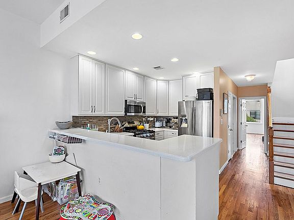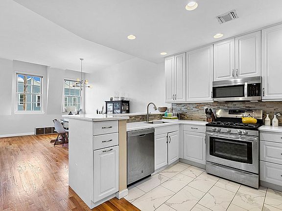 Step inside this stunning and spacious townhome perfectly located near the PATH and downtown ferry. With 3 stories of generous living space, this lovely 3 bed, 2 full bath, 2 half bath home will not disappoint. The first level hosts 2 large bedrooms with bountiful closet space in each room, a full bath with a bathtub, and a laundry room. The second level boasts a wide open living/dining space with oversized windows allowing natural light to fill every corner. The modern kitchen features white sleek counters, stainless appliances, a 5 burner stove, cabinets to the ceiling for extra storage, a large pantry, and a breakfast bar. The massive master bedroom features 4 large windows for tons of natural light, a walk-in closet, and a master bath with a double vanity, oversized jetted tub, and separate stand up shower. Also on the second floor you will find lots of closet space and a half bath. Stepping up to the third level you will find a large den with access to two huge balconies making this space perfect for entertaining! One balcony is 23x23 with NYC views and the other is smaller at 23x12. Additional features include gleaming resurfaced oak flooring throughout, garage space for 2 car tandem parking with an additional space outside the garage to park, an enclosed courtyard where neighbors regularly host events and serves as a semi-private playground for children and their families to play, a private elevator from the garage level for easy transport of groceries in about a minute, and potential office space with its own half bath on the garage level. This home truly has everything you could ever need...you may never leave!