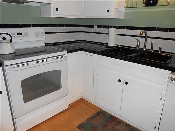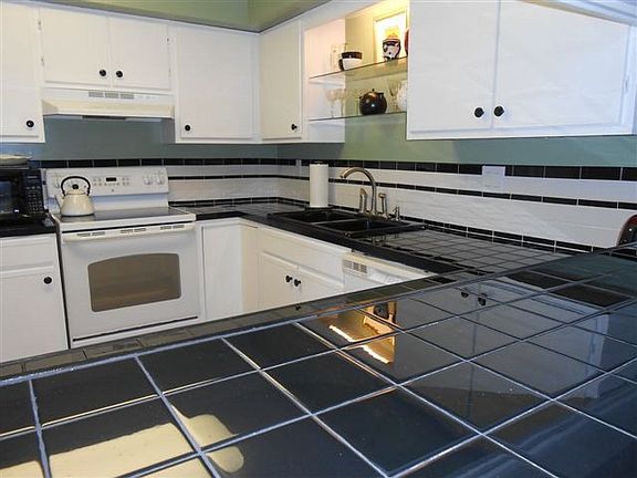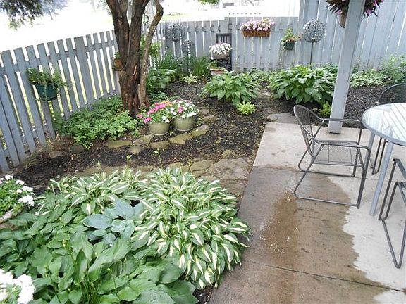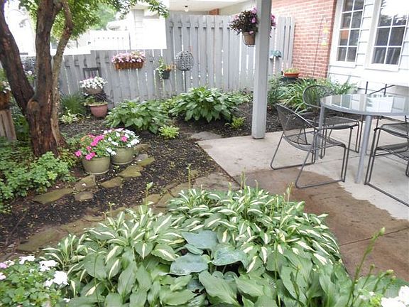 Uniqueness throughout this end unit. The living room has built-in shelving on both ends, the kitchen has tile countertops and backsplash, the bathrooms have been updated...it all has a very special look. The patio area is very private and has been wonderfully landscaped.