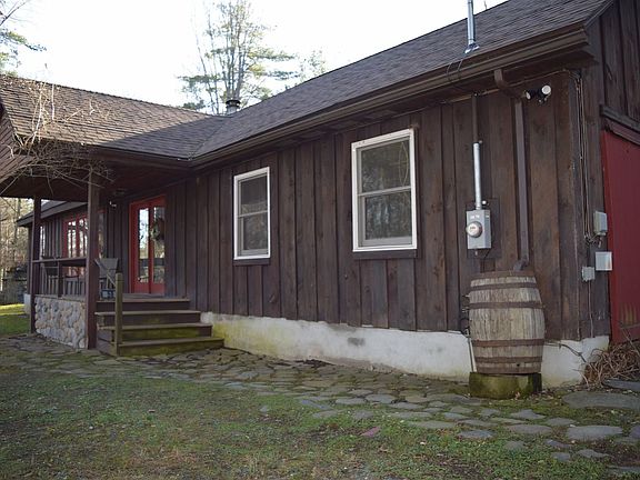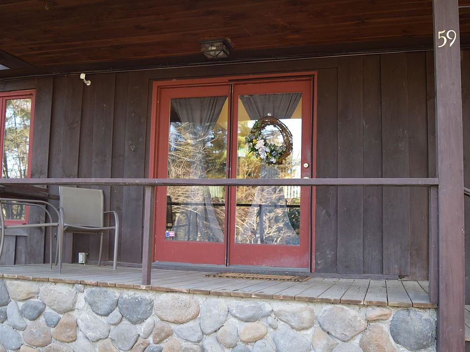 Dreaming of a cabin in the woods with a seasonal lake view Look no further! This tastefully decorated 3 bedroom, 2 bath ranch is situated on a 1 acre wooded lot. It has two stone fireplaces, one in the formal dining room and one outside, next to the sundeck. There is a spacious home office with built in shelving that can be accessed from the living room or master bedroom. The kitchen boasts an island and brand new stove. The main floor laundry area makes one floor living a breeze (washer and dryer are not included). Plenty of storage can be found in the attic loft above the master bedroom and in the hatch in the living room. Vaulted ceilings and hardwood floors are among the many features this home offers. Nine new windows and a new slider will be installed before closing.