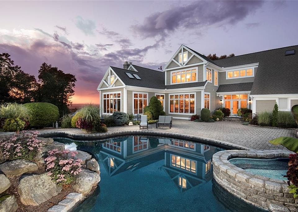 Rarely available, this very unique & spectacular home is located in a small, private, gated community. The custom design focus takes full advantage of the natural attributes of the surrounding 10 acres of land. The house design allows all three levels of western facing rooms maximum access to the far reaching and panoramic views towards western CT and stunning year round sunsets.The superior aesthetics of this home's interior design and build are rooted in the classic Colorado Lodge. Interior highlights include exposed gable beams, wood timber framing and stunning field stone fireplaces capped with a custom designed and laser cut mantle and hand hammered custom metal worked fireplace doors, the blend of southwestern art and architecture makes this a truly remarkable home. A two and a half story foyer grand entrance invites all friends and family into your beautiful home and encourages all thru to the expansive landscaped patio and sitting area as well as the unique pebble tec in ground pool with integrated stone features. This is a home that welcomes you and everyone you know in and encourages all to stay and enjoy the beauty of architecture, nature and good company - Welcome Home