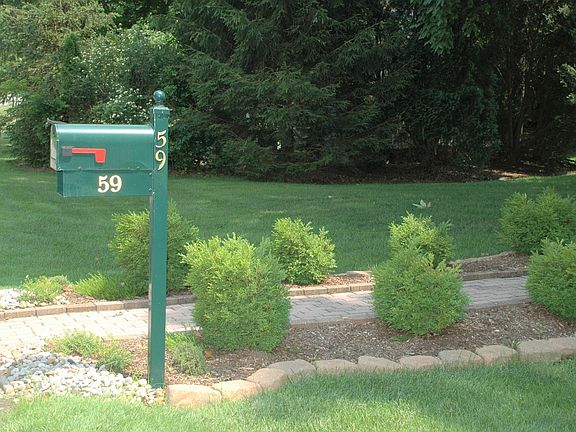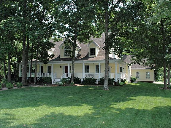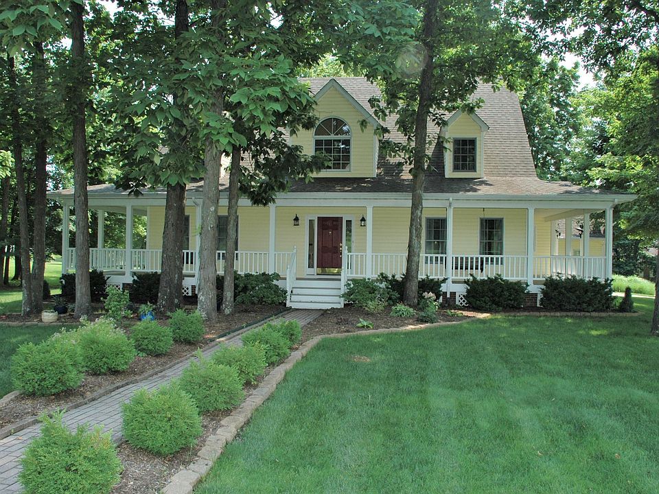 Lovely and comfortable maintenance free cape nestled on a treed lot with a picturesque wrap-around porch. Recently refinished hardwoods cover most of the first floor and one year old carpet on the second floor. The kitchen features an abundance of oak cabinets, corian countertops, terraced breakfast bar, tile backsplash, and full appliances including a five-burner gas stove, built-in microwave, and double oven including convection plus a bay window seat that overlooks the outside kitchen. Formal dining room with double crown molding, chair rail, and porch entry. 1st floor master suite with hardwoods, recessed lighting, and an adjoining master bath with a walk-in closet, raised two bowl vanity, walk-in shower, and Jacuzzi tub. The great room features hardwoods, built-in cabinetry, and a