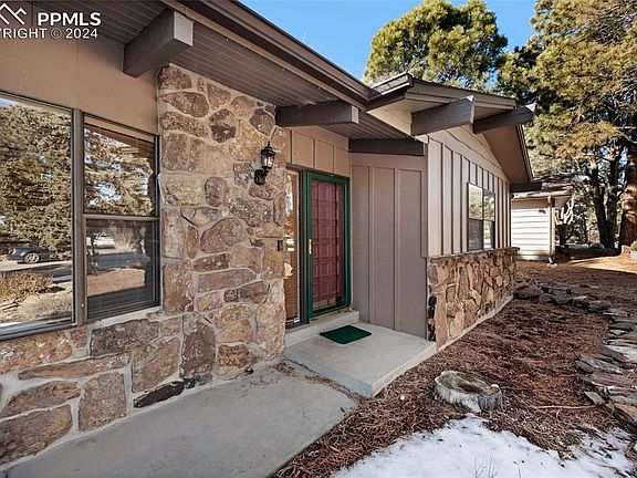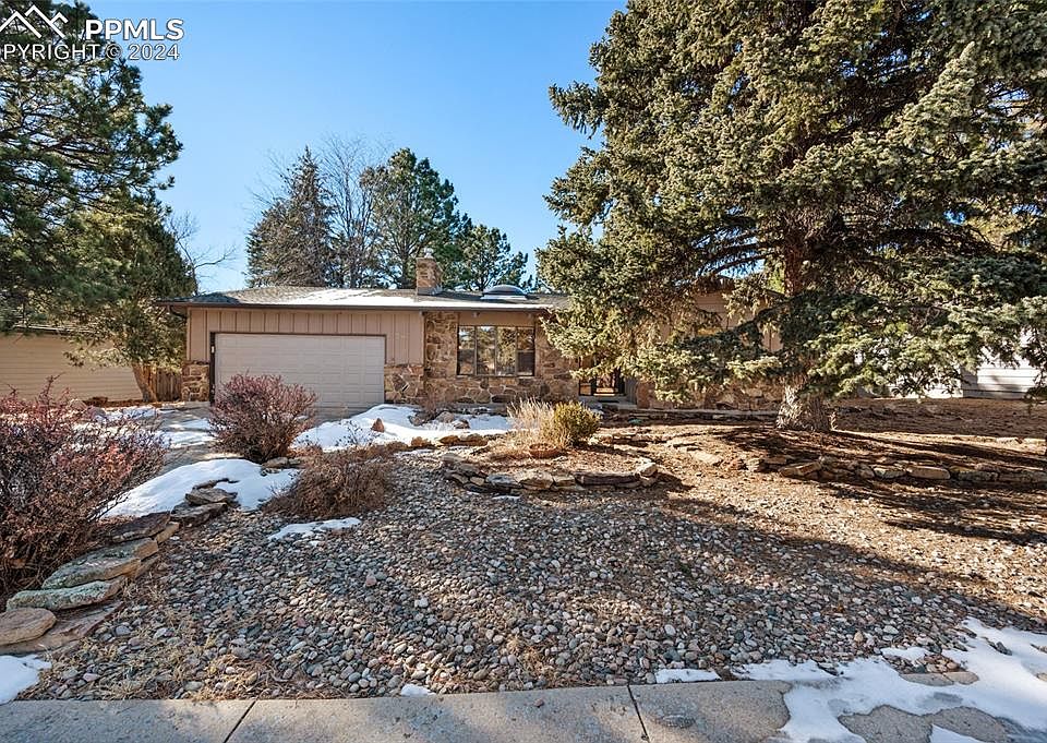Wonderful, one level living in the highly sought-after Rockrimmon community! This ranch residence epitomizes tranquility and meticulous care, boasting a serene ambiance surrounded by mature pine trees. The xeriscaped front yard showcases a blend of flagstone and decorative rock, creating a welcoming entrance. Step inside to discover a grand open living room and dining area adorned with vaulted ceilings, a skylight, and charming wood beam accents. The spacious kitchen has undergone a newer remodel, featuring newer appliances, an abundance of storage cabinets, and a delightful bay eat-in nook. The home offers three generously sized bedrooms, with the primary bedroom featuring an en-suite for added comfort. The full guest bath has been updated as well. The allure extends to the oversized backyard, providing a perfect retreat with abundant trees for shade and privacy. A convenient storage shed complements the outdoor space and perfect for tools and gear. Enjoy the convenience of this location, just minutes away from neighborhood parks, shopping, dining, and easy access to I-25. This property seamlessly combines a peaceful setting with modern comforts, making it a truly exceptional home in Rockrimmon.