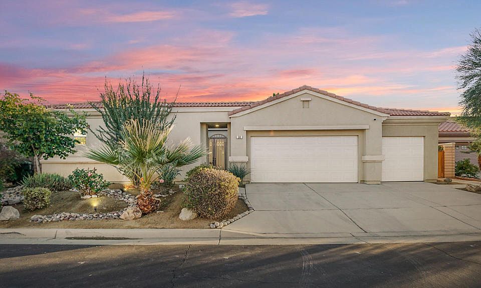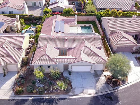 Welcome to Lantana! In the heart of Palm Desert, just blocks away from El Paseo shopping & dining awaits this gorgeous & private-feeling gated community. Here at 59 Rocio court, the rooms are grand, ceilings are high & can imagine endless opportunity for entertaining & relaxing. Enter through the gated courtyard through double glass doors and land at the grand foyer room welcoming one home. The flow from the entrance through the immense great room & into the kitchen & living room are seamless. The kitchen offers all stainless steel appliances including a large fridge, two ovens & full range hood. For the Chef of the house, large slab granite lies across the island/ breakfast bar & separate minibar/sink between the great room. Matching this slab granite, throughout the home there are cut & placed in granite squares detailing each room, as well the foyer room has a granite band outlining the room. The lavish primary bedroom has a separate sliding door leading towards the pool/ spa, new detailed flooring (in all bedrooms) comfort the space, a large walk in bathroom with double sinks, double shower heads, built in massaging bathtub & and a large walk in closet. Brand new washer/dryer, three car garage is lined with floating cabinets & overhead work lights. Low HOA fee of $111! This home is a must see and few are usually available in this community! Brand new security system & solar payments will have to be assumed.