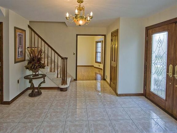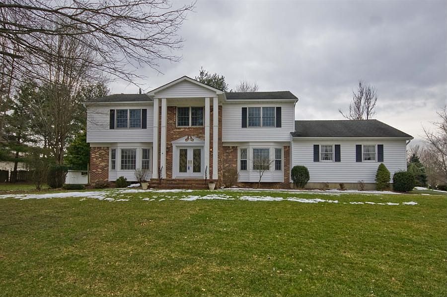 Updated elegant Center Hall 5 BR 2.5BA Colonial.Full finished dry basement.Beautiful finished Hardwood Flrs thru out most of home(some under carpet).Open updated kitchen w fruit wood cabinetry,granite C/tops,penisula breakfast bar,New SS professional range w warmer,Bosch DW.Open F/R brick gas FP & dramatic wall of windows.MBR suite has dressing rm.Updated BA'S & whirlpool.Newer roof,gutters,garage drs,HWH.Freshly painted.Anderson sliders to deck w awning.Spacious rm sizes.Great commuter location