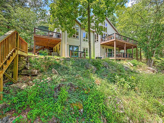 Table Rock Lake frontage home, lake view and lake access too! Open floor plan w/varied 17' high wood beam ceiling in living room, ample window configurations to take advantage of architectural home design and maximize light exposure, plus wood flooring in the common living areas add to the warmth of this home. Easy access to decks: living area, kitchen, master bedroom, lower level kitchenette, & family room - All with lake view! Recent upgrades: 2023 Architectural roof,washer,dryer,two water heaters, 900 sq ft deck/rail,Quartzite kitchen counter,lower level carpet and lift pump.Living room and master bedroom have gas fireplaces with an additional lower level heat by wood stove.Primary ensuite affords double vanity, whirlpool tub w/glass block, tiled walk-in shower and 2 closets. There is also a second bedroom & full bath on main level.The main level utility room:washer,dryer,sink,folding table,closets.Lower level:den,2 beds,full bath,kitchenette.Hardy board siding for easy maintenance.Make this happy home yours!
