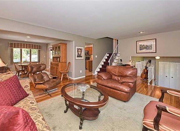 Bright open and inviting expanded Split offering 4 bedrms, 1 full, 2 1 2 baths and pool.This fabulous home w great curb appeal shows pride of ownership throughout!Foyer leads to a Den w WB fireplace and access powder and laundry.Sun filled Living Ro w large bay window flows into the Dining Rm with adjacent Family Rm addition. The Family Rm has a barreled ceiling, gas stove and is adorned w windows providing plenty of natural light and access to trex deck and yard. Well appointed Kitchen with SS appliances and quartz counters. Expansive Master with ample closets and 1 2 bath, 3 add'l bedrms and main bath complete the 2nd floor. There is no lack of storage in this home with 2 attics and a large unfinished basement. The serene and manicured property enhanced with a white picket fence a pool, level yard, patios and decking for entertaining. Add'l features include, hardwood flrs, Roof 2014, Driveway 2015 and 2 car garage. Home is convenient located to NYC transit and major highways.