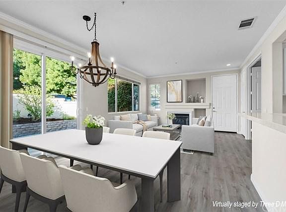 Welcome to 59 Seacountry Lane, a rare single level townhome in a gated community that feels like a detached home with large patio yard area and no one above or below. Immaculate interior welcomes you as soon as you enter this home. Open concept floor plan leads your to the living room with adjacent dining area that sits beneath a beautiful chandelier. Kitchen boasts bar seating, Quartz counters and large stainless sink. Quiet location close to the association pool and spa plus walking distance to resort style Las Flores community pool. Recently painted 2 bedroom and a den that can be used as a 3rd bedroom. Inside Laundry and new LED light fixtures to lower the energy bills. Master Suite is the perfect getaway with quartz counters, tile floors and separate soaking tub and walk-in shower. 2 Car direct access garage with extra storage. This home shows very well and is ready to move into immediately.