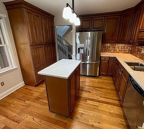 The updated kitchen with plenty of cabinetry, stainless steel appliances, quartz countertops and a island making meal prepping a breeze! The 1-car garage is accessible from the kitchen which is great for shopping.