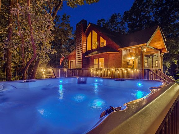 Welcome to the Hideout cabin in Ellijay's Coosawattee River Resort 5 minutes to town. Relax in your dreamy 3 bedroom 3 bath spacious open concept home with a rocked 2 story fireplace. One bedroom on each level make this perfect for full-time or vacation home (short-term rentals are permitted in resort). Primary suite is upstairs with seperate corner tub and shower, loft and private porch. Jump into the hot tub, cozy by the stone fire pit, play games on the screened-in porch or play in the game room downstairs. This a must see! Laundry is on the main level. Enjoy 3 pools (one indoor heated), fitness center with game room, mini-golf, pickleball, tennis and the 5 riverfront parks which accommodate tubing and kayaking for your friends and family. Go fishing steps outside the door in the fish pond or the river just a short walk away down a stream side walking path. Great big storage room downstairs!