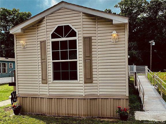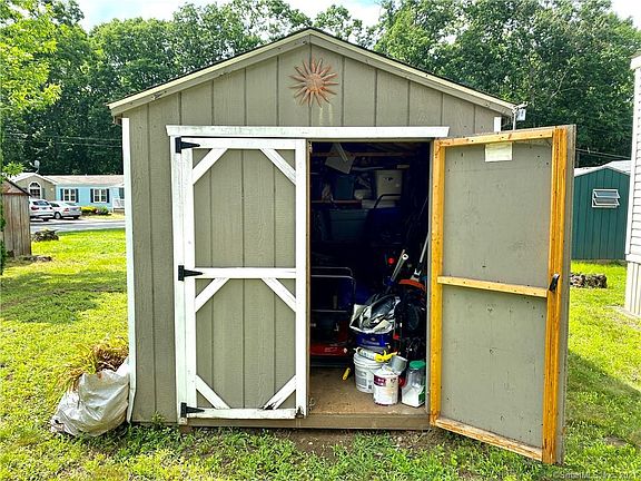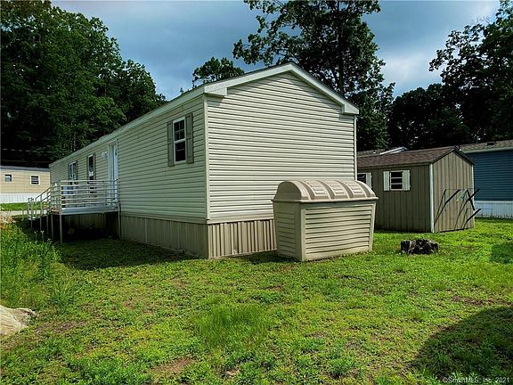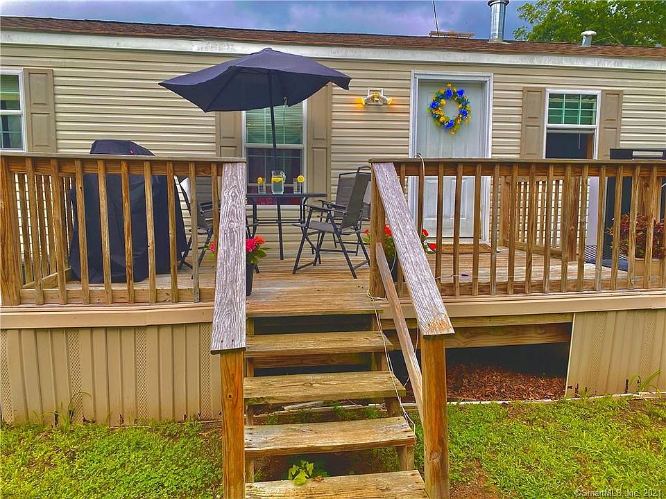 Right away you will notice the pride in ownership. This clean and well-kept home is in move in condition. The bedrooms are on opposite sides of the home, each with their own full bathrooms. The bathroom on the master side has handicap access. The room is perfect for a queen size bed and has 2 closets. The kitchen has plenty of storage with the oak cupboards and additional space with the handsome built-in hutch. The open floor space offers a very large living room with perfect cross ventilation due to all of the windows. There are two exit doors, one by the laundry room and the front door which leads out to a large front deck. The yard is well manicured. There is a handsome wood storage unit to house your mower, yard tools and to store the patio furniture. The park allows two pets (park owners discretion on breed.