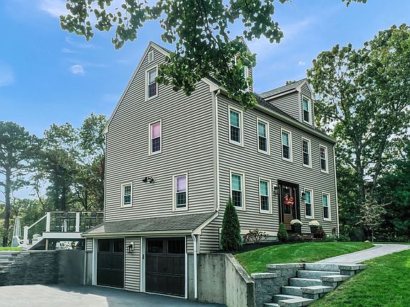 Well-loved Colonial located on a quiet street in the town of Plymouth. Surrounded by lush greenery this home is set back from the street on a picturesque lot. This four bedroom, two bath home is a short walk to the beach. Chef's kitchen has an open floorplan with new stainless steel appliances, quartz countertops, large island and sliders to the outdoor deck. The dining room is flooded with light. Five inch oak hardwood floors. The front to back living room has plenty of space to watch the game with friends or curl up next to the fireplace. A full bath is on the main level. The primary bedroom is sizable and has a walk-in closet by California Closets. A second full bath is located on the bedroom level. Two more airy bedrooms with lots of closet space. The private fourth bedroom is the entire third floor. A great getaway. Two car garage keeps your vehicle free from the winter snow. My favorite part of this home is the private backyard with Sonos outdoor audio and a granite fire pit.