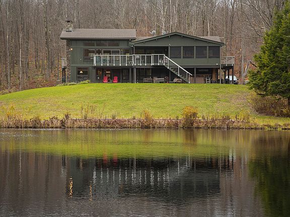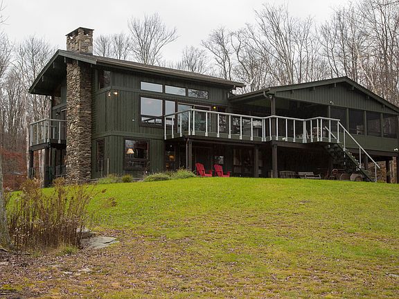 Privacy, large acreage, top of the line construction...Wonderful opportunity for those seeking a beautifully constructed, privately situated post and beam residence with ample acreage for hiking/biking/cross-country skiing, recreational pond for fishing/swimming and boating. Golfers will love the proximity to Tennanah Lake Golf and Tennis Club, just two minutes down the road; trout fishers can enjoy their favorite past time in nearby Roscoe, just five minutes away, with the famous Beaverkill and Willowemoc and miles of blue-ribbon trout fishing. This four-bedroom home is masterfully crafted, with soaring oversized thermo-pane glass windows and glass sliders that effectively bring the outdoors in - with views of the scenic pond, woods and private trail from inside the house, as well as from the three decks and stone porch. Nature enthusiasts will enjoy watching fish rising in the morning and ducks landing on the pond at sunset, deer and turkeys on the lawn. Glass sliders to access the private deck off the master bedroom adds even more of an outdoorsy feel and plenty of clean, fresh Catskill Mountain air on warm days. Those who love to cook will appreciate the custom kitchen's twin ranges and two ovens. A metal backsplash surrounds the beautiful granite counters that echo the greens on the mossy rocks and boulders outside; cork flooring and birch cabinetry add to the beauty of the room. A screened-in porch just off the kitchen provides clear views of the pond below and is accented by top-of-the-line lighting fixtures and railings. Fine craftsmanship and special details, such as the copper rain chains off the front portico and lintel; custom wrought-iron hardware; see-through California wire deck rails and plate glass staircase half-walls and massive native fieldstone fireplace make for an impressive home. Cathedral ceilings and skylights, exposed beams and a 27-foot span from livingroom through dining room to kitchen provide light and spaciousness. A two-car garage and full basement with mudroom walk-out offer plenty of storage for boots, skis, sleds, fishing and golf gear; generous storage space is also found in the custom closets in each bedroom, including a walk-through in the master suite, and built-in cabinetry. Curved stone veneer foundation and additional use of stonework add to the appeal of the professional landscaping around the house. A scenic trail begins just steps from the side lawn and continues through the 47+ acres, curving around behind the pond, and providing four-season outdoor activity for a welcome hike, jog or cross-country ski in winter.