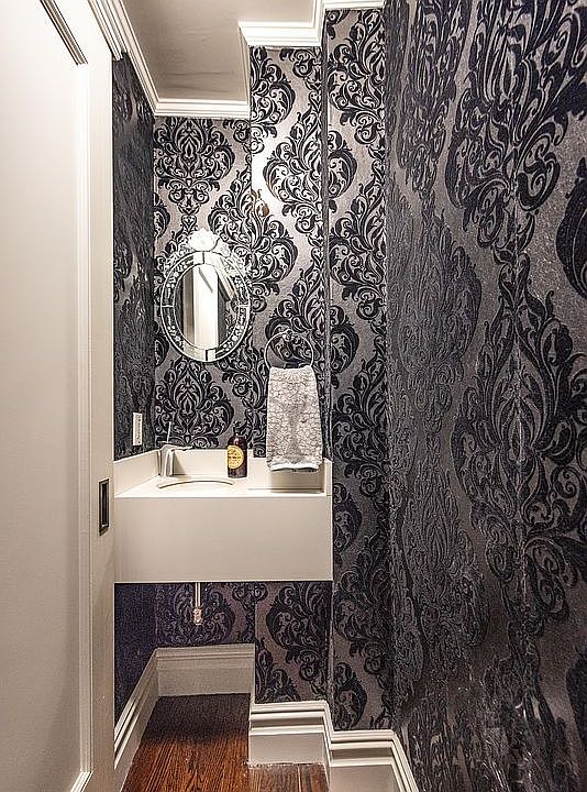 The chic powder room adds a touch of glamour with dramatic brocade wallpaper—an ideal balance of elegance and charm.