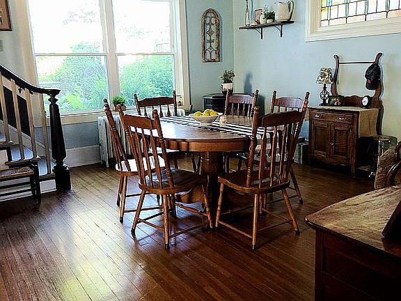 Spacious Borough parade route home with front & side porch, large rooms, front & rear staircases, hardwood flooring, fully remodeled kitchen (2018), pellet stove supplement heat, 2nd floor office, 1st floor laundry, 1st floor bathroom w/shower, 2nd floor bathroom w/clawfoot tub/shower combo, lots of closet/storage space, full walk-in attic, rear deck, 2 car garage w/2nd floor workshop, additional off-street parking space, and fully fenced in yard.