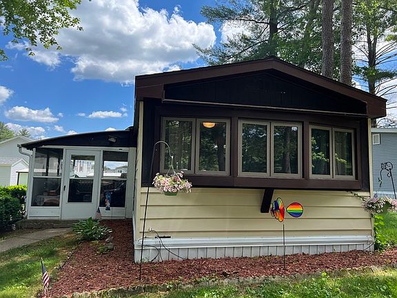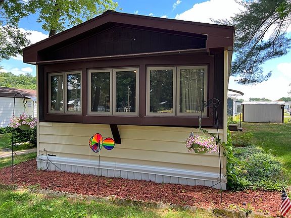Another opportunity for affordable retirement living in Hampden Village! This single wide home is warm and inviting and also in a great location. You will enter through the private 3 season room and right away feel like you're "HOME". In the center of the home, the eat in kitchen is open to the lovely sized living room with a convenient breakfast bar between the two. The front bedroom features bow windows overlooking the Westfield Fair Grounds, built in dressers, double closets and a half bath while the rear bedroom has a similar setup with the built in dressers and the bow windows. Hampden Village is a retirement community, buyer must be age 55 or older and is responsible for obtaining park approval. Don't miss this one, like the others it will be gone fast! Inground oil tank and septic are the responsibility of the park. Lot fee is 416/mo and includes taxes, water, trash and use of community clubhouse, dog park and heated inground pool.