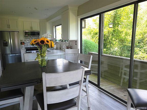 Waterfront End Unit featuring a Wraparound Deck located on Harts Cove with views of Moriches Bay and the Westhampton Dunes area of Dune Road. Kitchen, Living and Dining area 2 Bedrooms, 2 baths on the main level. MANY UPDATES! The lower level has a finished area and an entry through the garage with a designated parking space for your use and guest parking area. Heated Pool, Tennis Courts and Pickleball....