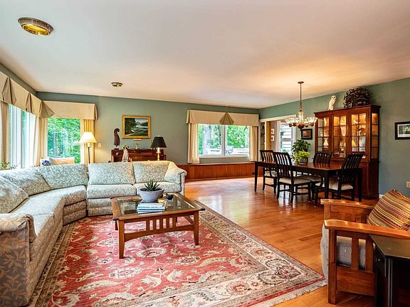 You'll gasp at the stunning seasonal panoramic Hudson River views from the great room in this gorgeous mid-century modern home in Beacon's exclusive Wodenethe enclave! This home sits on just over an acre of the twenty-acre parcel purchased by Henry Winthrop Sargent in 1840. Sargent's passion for specimen trees and plants made Wodenethe famous as the forerunner to many successful arboretums. The entry leads to the kitchen with pristine white cabinetry, quartz counters, and gorgeous Moroccan glass backsplash. Entertain guests over the island or lose yourself in the river view at the kitchen table! The very spacious living room features a wall of windows that seasonally showcase the Hudson! An open plan allows the living and dining areas to enjoy one of two wood-burning fireplaces in the home, as well as access to the deck. Bright yellow forsythia welcomes the spring, while dogwoods, plum, cherry trees and numerous perennial gardens announce the summer! The master bedroom and en suite bath overlook a rare and breathtaking 200-year-old weeping beech tree. The second bedroom on this level overlooks gorgeous dogwoods and has a perfectly retro bath en suite. Beautiful hardwood floors throughout, and a wing with laundry and half-bath complete this level. The lower level may be accessed from either of two staircases. One descends directly to a roomy yet cozy library / office with lots of built-ins for media storage and books, and a delightful nook to curl up with one of them! The family room, with a terrazzo floor, is wonderfully sunny, has hardwood floors, a terrific wet-bar and fireplace for entertaining, and easily hosts a pool table. This room opens out to the patio via a few marble steps with provenance as the steps and marble bench are preserved remnants of the Henry Winthrop Sargent estate. The second staircase takes you to a guest suite with dressing room and bath. Excellent mother / daughter potential. The two-car garage with ample workbench is attached. This home boasts plenty of storage, a cedar closet, tons of light, antique specimen trees, new roof, furnace, and windows, and has been lovingly and attentively cared for as the current owners have been amazing stewards of this special and stunning property. Come and enjoy the tranquility of this setting just a few minutes from the Metro North Beacon station, the DIA museum, and a short distance to Main St. restaurants, live music, antiques, and all that Beacon offers.