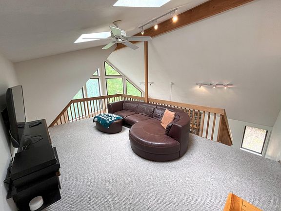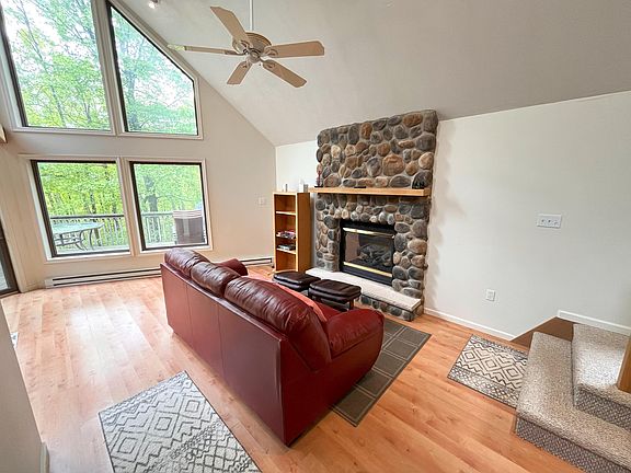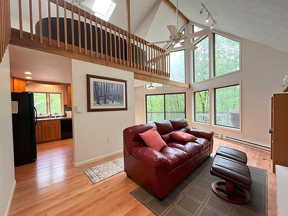 3 bed/2.5 bath Chalet on 5.03 acres in Pleasant Valley West bordering PA State land for sale!!! This home sits on a lushly wooded 5 acre parcel where you can get away from it all! Being sold fully furnished! The great room showcases vaulted ceilings, hard surface flooring, & propane fireplace! The open concept design provides gorgeous views of the wall of windows facing the wooded acreage! The well-appointed kitchen features exposed shelving, ample counterspace, & breakfast bar seating! The spacious, oversized loft is a wonderful second living area! 3rd fl primary suite w/ double vanity! Finished 1st fl bonus room & full bathroom! The unfinished family room has untapped potential - finish to your liking or use as storage! Relax on the front deck and enjoy the serene surroundings! Enjoy Pleasant Valley West's lake & beach! Minutes to hiking, biking, rafting, & more! See today!