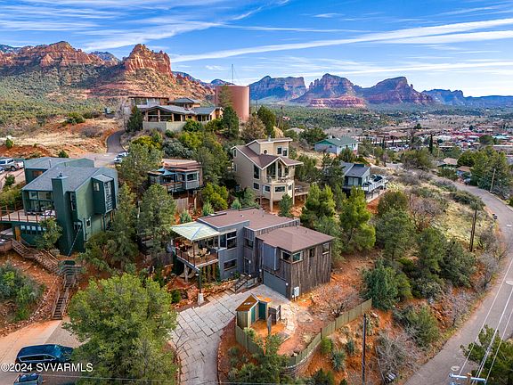 Unique Sedona landmark property built on an ideal Uptown hillside lot with unblockable red rock views. Design aesthetic reigns supreme inside and outside this modern rustic home incorporating concrete, metal, wood and glass into one of Sedona's iconic architectural properties. Outside living space features massive red rock views and sits just a short distance to Jordan Trailhead for miles of uninterrupted trails for wilderness exploration. This two story elevated home in a quiet 'hood is perfect for full time living or could be rented to maximize cashflow. Detached 1 bedroom casita accessed by another road for privacy has a 5* rating and grossed $110k for 2023. Use the main house for your own getaway and have the casita pay for itself or roll both epic properties into your portfolio.