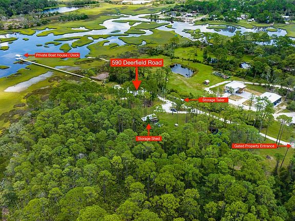 This is truly a one of a kind piece of property, it is like owning your private sanctuary on this estuary front oasis in St. Augustine. Serene sunrises to greet you each morning only to be interrupted by the calls of migratory birds and the deer feeding off the porch . Large covered boat house(with lift) granting access to some of North Florida's finest fishing. Manicured property with shell driveway a mobile home with a large deck. This land buffers 50 acres of state land to the north. Just a short boat ride to the St. Augustine Inlet and Historic St. Augustine. Don't miss this RARE opportunity to own a bit of paradise on 2.48 acres of possibilities. The Mobile Home has been used as a VRBO since January 2023(history attached). Located on this property is a small pond, a workshop with electricity and running water. So much to explore and enjoy. Check out the Video .