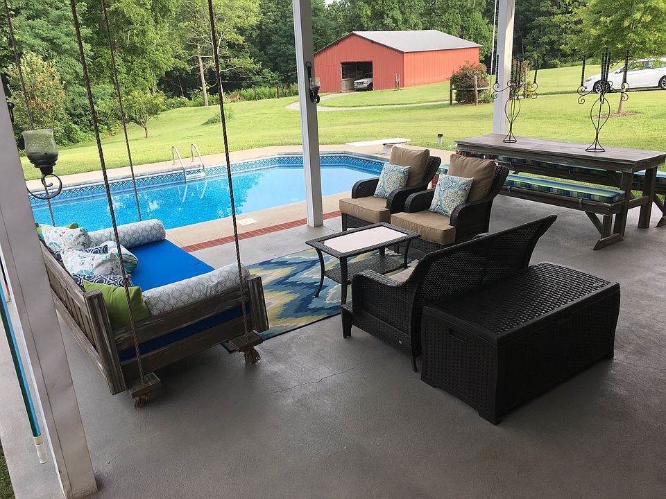 8.39 acres, barn with stables & electric & water, concrete drive, fire pit, hardwood & tile throughout, large kitchen with tons of cabinets, granite countertops, walk-in closets, 3 full baths, custom built-in cabinets in office/den/cubbie area, fresh paint, walk in attic space, full basement that spans the entire home, oversized back porch with hanging bed, established landscaping, inground pool, custom touches throughout the home, very private but convenient to town, unique piece of property