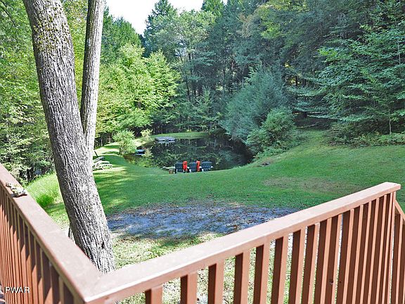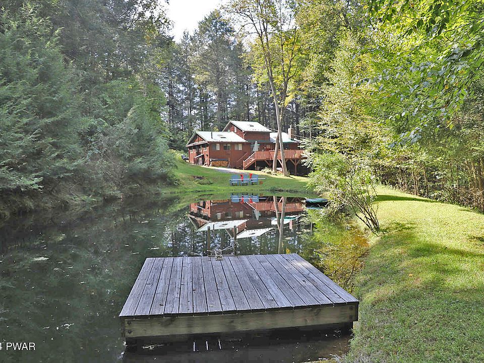 This distinctive home in Milanville offers privacy, quietude and beauty. Situated nicely above a low-traffic road, under a canopy of trees, it feels like a treehouse. Walk up to a fantastic deck that overlooks a lovely pond. Great for outdoor dining and nature watching. Step inside and you enter a great room filled with natural light. The dining area has wood floors, high ceiling and a fireplace for cozy meals. Cooks will love the sparkling kitchen with Bosch stainless appliances, granite countertops, wood cabinetry and a wonderful kitchen island that allows one to cook and entertain guests at the same time. The living room / den has a woodstove and lots of windows. First floor primary bedroom has a woodstove, and efficient walk-in closet, and ensuite full bathroom with laundry. The house with three bedrooms and 2.5 baths is just right--not too big and not too small. Perfect for either a getaway or primary home. Everything has been well maintained and major systems such as septic upgraded with a new leach field. A metal roof and stained exterior make for low maintenance and longevity. The private setting offers the convenience of being near the Delaware River and the thriving hamlets of Callicoon and Narrowsburg, with their shops, supermarkets, restaurants, breweries, and farmers markets. Need big-box stores and more commerce? Honesdale is 20 minutes away. Two hours NYC.
