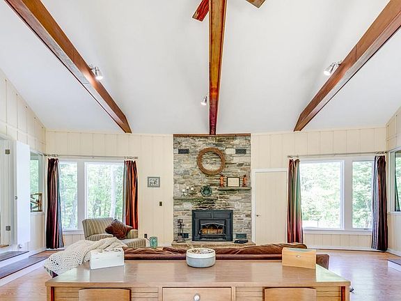 One floor living at it's finest This sprawling ranch has a unique layout that you will love The center of this crescent shaped home is a stunning living room with vaulted ceilings, large windows that let the outdoors in and a gorgeous stone fireplace This room just begs for entertaining a crowd The west wing of the home is the guest quarters with 3 nicely sized bedrooms, a full bath, laundry room and an open den area. The east wing houses the kitchen (complete with original dumbwaiter, dining room, half bath and master suite The dining room and kitchen flow nicely into the living room making day to day life or entertaining a breeze The master suite includes an updated full bath and enough room for a cozy reading area as well. Moving down the spiral staircase to the lower level you'll find a fun finished space, perfect for the kids or grandkids to get away This level even has a half bath A true gem