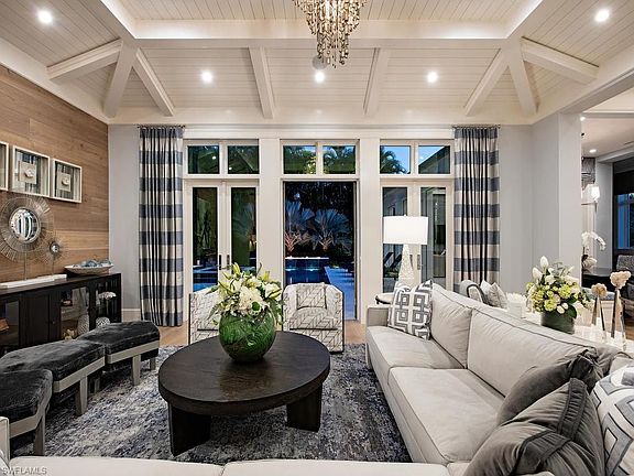 Award-winning coastal contemporary Moorings home, perfect for the most discerning of buyers. Custom built in 2018, this spectacular property received 10 Sand Dollar Awards including Design of the Year & Interior Design of the Year. Featuring an expansive great room floor plan with high/detailed ceilings, double island kitchen, Cristallo Quartzite, Sub-Zero/Wolf appliance suite, butler's pantry (with second dishwater, steam oven, fridge) coffee bar & wine bar. Fully automated Elan home system, impact glass throughout + whole house generator. Impressive master suite with attached study, theater room, guest suite, powder room and second workspace complete the main level. Second level has three generously sized guest suites and large multi-use bonus room. Resort-style backyard oasis with preferred southern exposure boasts a saltwater pool with spa, water and fire feature, poolside cabana, fire pit, covered living/dining space, retractable screens & shutters, an outdoor kitchen and fireplace. Framed by gas lanterns, lush landscaping surrounds the paver driveway with 3 garage spaces. Stofft Cooney designed, Knauf-Koenig built & interior curated by Clive Daniel.