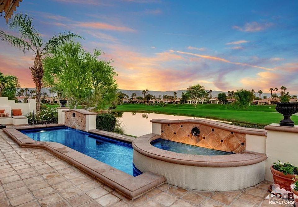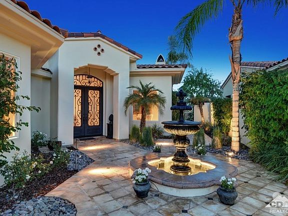 Immeasurable elegance in this sought after O2 floor plan w/panoramic mountain, double fairways & waterfront views. The gated courtyard adorns a flowing water fountain amidst lush landscaping leading to exquisite wrought iron entry doors. This home features custom carpet, designer finishes, window coverings, marble floors & granite countertops. The open floor plan showcases the beauty of the formal living & dining areas in addition to sitting in front of the beautiful fireplace for those colder evenings. The family room & wet bar allow extra seating to enjoy the sounds playing on the piano. The tiled outdoor living space has built-in seating around the granite fire pit & outdoor kitchen. The pool & spa are perfectly sized & feature descending waterfalls. The master suite has a raised hearth fireplace w/marble finishes in the large en suite bath. The handsomely decorated office w/built-ins can be reconfigured for a second guest suite. Club or Golf Membership available.