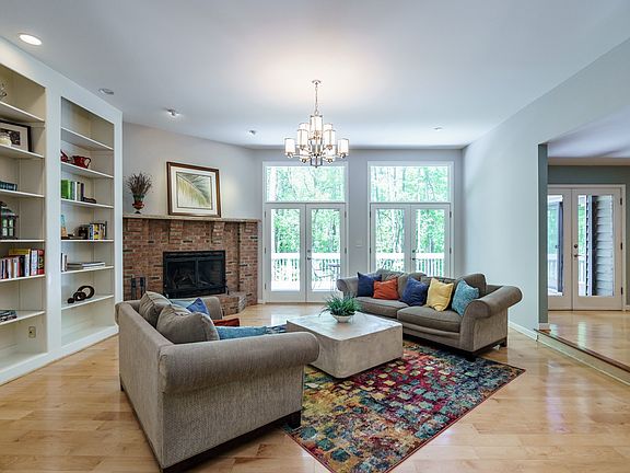 Rare Ranch Home on Wooded 4.39 Acres Backing to Jordan Lake! Open floor plan w/high ceilings, hardwood floors, built-ins, tons of natural light. Open eat-in kitchen w/double ovens & large pantry. Owner suite has its own fireplace & direct access to the large deck. All bedrooms have walk-in closets & share a large jack & jill bath. Office w/pocket doors. Huge sunroom! Spacious mudroom w/extra storage, pet shower & pet door to a fenced yard. Walking trails to the lake & county park! Abundance of wildlife!