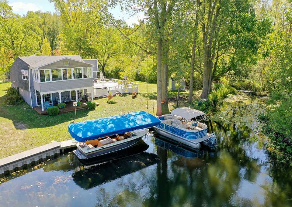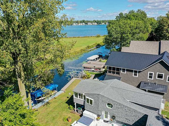 Updated & move in ready! Over 75â of channel frontage on Lake Wawasee. Rare opportunity to purchase a very private setting incorporating a home bordered by Wawasee Area Conservancy Foundation. Two parcels are included. Channel waterfront w/home that encompasses an adjacent wooded lot, plus vacant lot across the street with no neighbors across the channel; ideal for walking your dog. Home has great view to lake/Conklin Bay and Oakwood Resort. George St is a private and exclusive area on the lake. Conveniently located close to town by car or boat. Currently, a pier section/bridge is set up on land to walk to the other side of the channel. Quality updates throughout this 3-bedroom channel front home on Lake Wawasee. The upstairs features an open concept with a large living area, kitchen, dining & sunroom. Vaulted ceiling, exposed beams & big windows maximize the beachy vibe & water views. Continuing the coastal feel to this home, the kitchen has gorgeous cabinetry with grey/sandy toned finish, granite countertops, a breakfast bar, plus dining area has extended cabinetry & counterspace for ease in entertaining. Kitchen appliances, plus washer & dryer remain. Enclosed sunroom has a vaulted ceiling, plus a multitude of windows for expansive lake views. All 3 bedrooms have newly added French sliding doors to outside. Bedroom #1 has beautiful tongue in groove ceiling. Full bath has wainscoting & big walk-in shower. Multiple outdoor entertaining options with a huge wood deck & waterfront covered porch. Plenty of parking. 1 car detached garage has covered carport attached with room to expand garage. Convenient attic storage over both, plus 2 handy service doors on garage. Backyard shed for additional storage. Ideal for a quiet retreat, year-round living and a fabulous setting for entertaining family & friends. Lake Wawasee is the largest natural lake in Indiana; 25 miles of shoreline, 3000+ acres in size, with a maximum depth of 77 ft. This gorgeous lake is filled with relaxation, fun & recreation as an all sports lake for boaters & skiers, complete with a sandbar, 28 species of fish, boat accessible restaurants, marinas & yacht clubs. Pier #675