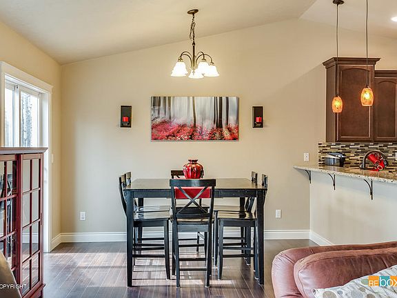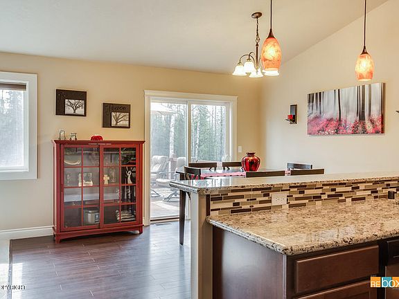 Custom Ranch with many upgrades: granite countertops in kitchen and baths; tile and laminate floors; custom cabinets; custom lighting; jetted tub; tiled bath enclosure; gas fireplace; vaulted ceilings with paddle fans in LR and MBR; HRV system; Rinnai on-demand hot water; front porch and rear deck. RV parking. Quiet neighborhood convenient to both Parks Hwy and Knik Goose Bay Road.