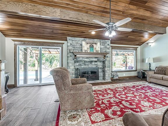 Meticulously remodeled home has solid wood doors, an open living room with new plank tile floors, cathedral-style tongue & groove ceilings, a stone fireplace, views of the Olympic-sized swimming pool, & space for a full-sized dining room table. The attached garage side has an office adjacent to a second master featuring a fireplace, full bath, & access to the back patio. The master suite upstairs features a jetted tub, walk-in shower, & access to a private deck. The covered back patio opens to the pool, featuring three waterfalls & a full outdoor kitchen. The shop is 40'x30', wired for 220, featuring a car lift (wired for 2nd lift), two roll-up garage doors for pass-through ventilation, & private deck. In total property will house eight vehicles indoors with private outdoor parking for 15.