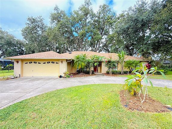 Welcome home to over 2,070 sq. ft. of tranquil bliss in this well-loved, move-in ready 3-bedroom, 2-bathroom home, perfectly situated on nearly a half-acre lot in the highly desired Deer Brooke neighborhood. Step inside to a bright and spacious living room, formal dining area, and soaring vaulted ceilings that create an open and inviting feel throughout. The primary suite is thoughtfully positioned on the left side of the home for added privacy, featuring a large walk-in closet and a relaxing ensuite bathroom. On the opposite side, you’ll find two comfortable guest bedrooms and a full bath, ideal for family, visitors, craft room or office space. Enjoy the convenience of a wrap-around driveway, two-car garage, and separate laundry room for easy everyday living. Outside, relax in the large screened-in patio overlooking a beautiful, tree-lined backyard with no rear neighbors. Recent updates include a new roof and water heater (2024), offering lasting peace of mind. Located in a quiet, well-established neighborhood, you’re just about an hour from Florida’s stunning Gulf beaches, Downtown Tampa, and Orlando’s world-famous attractions. Schedule your private showing today and experience the comfort, charm, and move-in ready condition this home has to offer.