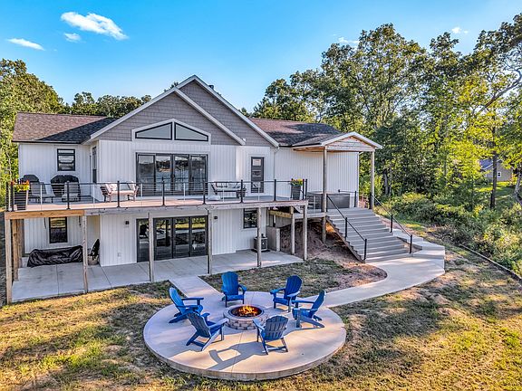 The main floor boasts a spacious open-concept design with cathedral ceilings, engineered hardwood floors, a cozy natural gas fireplace, and a wall of windows that showcase the lake views. The gourmet kitchen features granite counter-tops, soft close cupboards with a custom built pantry, and flows into the dining and living areas. The main floor also includes a luxurious master suite with a walk-in closet, double vanity, deep soaker tub, plus an additional half bath and laundry. The lower level offers two bedrooms, a full bath, a large recreation room, a second laundry, and a walkout slider to the firepit areaperfect for entertaining. Additional highlights include a 30x40 pole barn, central air, a hot tub, natural gas grill hookup, and a spacious wraparound deck.
