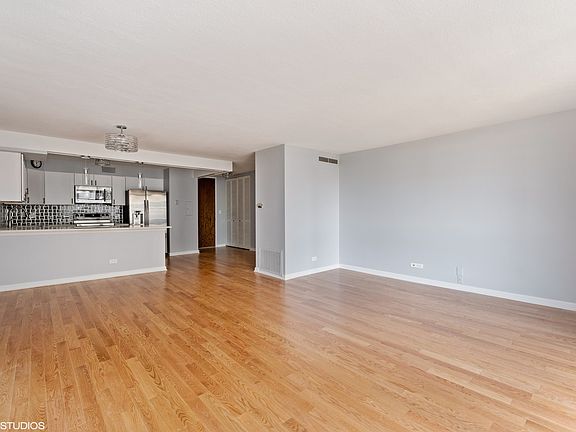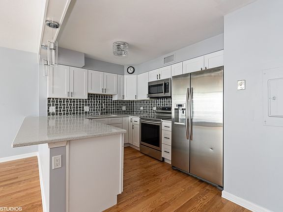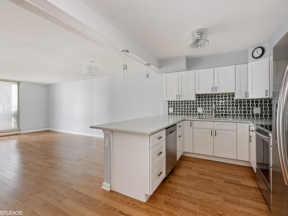 Enjoy your lake views and huge double balcony (5' x 30'!!) from this beautiful and fully renovated one-bedroom unit. Everything is new - kitchen, bath, floors, heating/cooling system, and all new windows. Kitchen has been opened up to living/dining area and features a large island, quartz counters, new cabinets and new stainless appliances. Bathroom all new as well. Real hardwood floors to top it off. This is the nicest one bedroom you will find in the area. Includes deeded, outdoor/partially covered parking space #8. Hallway on floor 11 slated to be renovated in 2020.