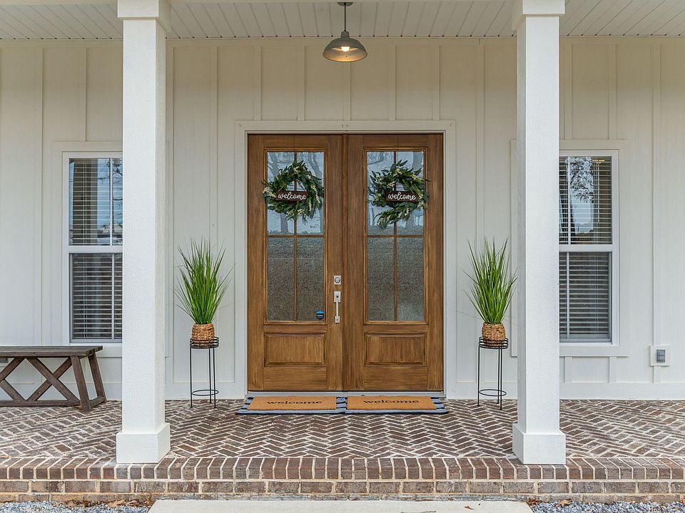 Experience modern farmhouse living in this meticulously crafted home, nestled on a spacious one-acre lot. With approximately one-third acre of wooded privacy in the rear, this property offers tranquility. Capture breathtaking sunsets from the expansive front porch adorned with stately columns, brick inlaid flooring featuring a herringbone design and a 8' tall 4-lite double front door.Step inside to discover elevated ceilings, artisanal trim work and an open floor plan that includes a wide foyer, a versatile office/flex space, and a generous living area. Eye catching built-ins enhance the inviting gas fireplace, while the adjacent dining room, with glass panel pocket doors, adds to the charm.The kitchen is a culinary haven with luxurious cabinetry, soft-close drawers/doors, quartz countertops, and massive 5'x8' center island & breakfast bar. Stainless steel appliances complement the beautiful farmhouse sink, positioned in front of a triple window overlooking the backyard.