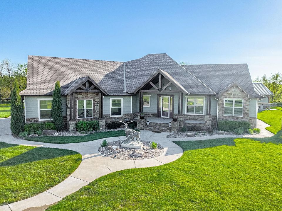 Step into your own slice of paradise with this extraordinary estate sprawling across over 70 acres of picturesque countryside. From the moment you arrive, you're greeted by the promise of a lifestyle defined by luxury and tranquility. Passing the waterfall feature in the circle driveway, your cares of the day start to fade away. Enter through the triple column entry, where a world of wonders awaits within. Crown cove accents the entryway, welcoming guests with understated sophistication. A marble entry floor sets a tone of timeless elegance, while custom wood shutters add a touch of refinement to every room and maple wood floors grace the main floor with warmth and elegance. Elegant beams adorn the living and kitchen areas, adding a touch of architectural intrigue. Two way stone fireplaces with custom mantle made from timber from the land is the focal point of this area creating an ambiance of rustic charm and comfort. The kitchen is the heart of this exquisite home, granite countertops, as durable as they are beautiful, grace the kitchen, offering a luxurious workspace that's both practical and visually stunning. Custom cabinetry, adorned with light rail accents, exudes timeless sophistication while providing ample storage space to keep your kitchen organized and clutter-free. A dedicated display area adds a touch of personal flair, allowing you to showcase treasured culinary essentials or decorative accents with pride. The island serves as the focal point of the space, offering additional prep area and storage for your convenience. Whether you're whipping up a gourmet feast or enjoying a casual meal with loved ones, this kitchen provides the perfect backdrop for unforgettable moments. Floating beams in the master bedroom and a tranquil fireplace, offering a haven of relaxation and serenity. The well appointed bath with custom tile shower and tub and to finish it off with the closet that is the envy of all closets. Entertain with ease in the full wet bar of the basement, featuring stone accents and a wine cellar capable of holding 300 bottles of your favorite vintages. The outdoor kitchen, meticulously crafted with a mortise and tenon frame and adorned with sleek concrete countertops, begs you to pull up a chair and enjoy dinner while watching the most amazing Kansas sunsets. Everything is ultra convenient, an outdoor half bath and shower offer effortless relaxation while you are catching some rays in the 18x40 heated pool, complete with a new liner and cover. Other memorable mentions not to be missed, custom tile showers and granite countertops throughout, while two master suites provide unparalleled comfort and convenience, each offering direct access to the outdoors. With two laundry areas, convenience is always at your fingertips. Find peace of mind in the storm shelter, ensuring safety and security during inclement weather. The oversized three-car garage boasts painted floors, a utility sink, and a drop zone for added convenience. Let's get outside!!! Discover the barn measuring 60x64 with a concrete floor and wood-burning stove, offering endless possibilities for hobbyists and farmers alike. The entire acreage is fully fenced with hot wire and features water lines with quick connects throughout. Not just one, but two ponds with charming concrete bridges. A fenced garden area with sprinklers makes gardening a breeze. Embrace the opportunity to make this extraordinary estate your own, where every amenity and indulgence has been thoughtfully curated to elevate your lifestyle to new heights of splendor and sophistication.